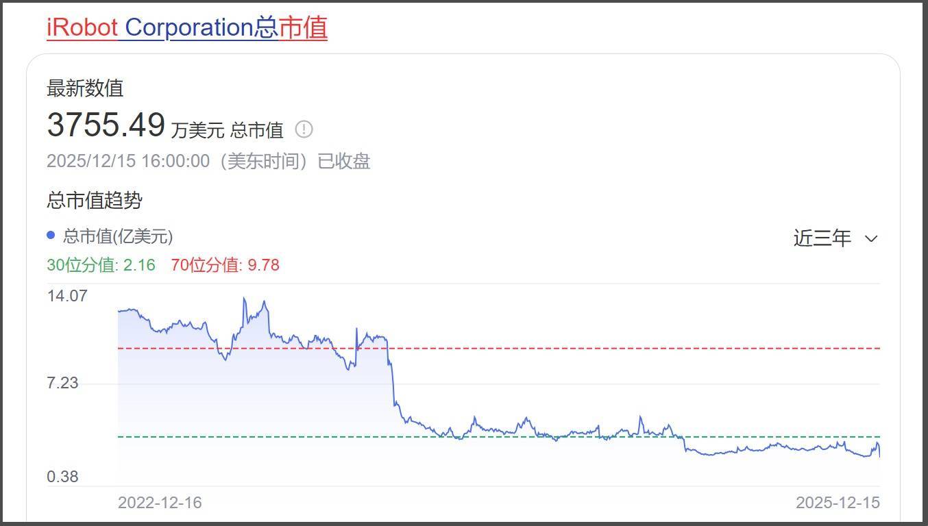 在资本市场,iRobot市值仅3755万美元,约合人民币2.65亿元。